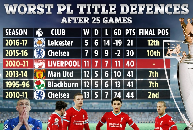 Chi tiết hơn, Liverpool có 11 chiến thắng, hòa 7 và thua 7. 4 vòng gần nhất họ toàn thua và cách biệt với đội đầu bảng Man City đang là 19 điểm, trong khi đó khoảng cách với Top 4 là 5 điểm. Bộ đôi huyền thoại MU, Paul Scholes và Gary Neville đều cùng chung nhận định rằng Liverpool là đội ĐKVĐ tệ nhất lịch sử Premier League.
