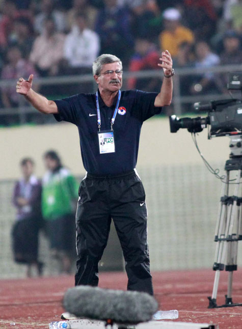 2. Cuộc đấu lửa - nước không chỉ hiện hữu trên mặt cỏ SVĐ quốc gia Lào mà còn hiện hữu cả ngoài đường pites của sân. Hai ông thầy Calisto và Darby bắt đầu cuộc chơi bằng tư thế rất lạnh. Cả hai đứng khoanh tay dựa lưng vào khung sắt của vòm khu kỹ thuật nhìn cuộc chơi. Nhưng không bao lâu sau, trong khi ông thầy Steve Darby chỉ bước lên 2 bước rồi đứng trôn chân với cánh tay khoanh tròn thì ông thầy Calisto lại “điên đảo” trên đường pites mép sân.