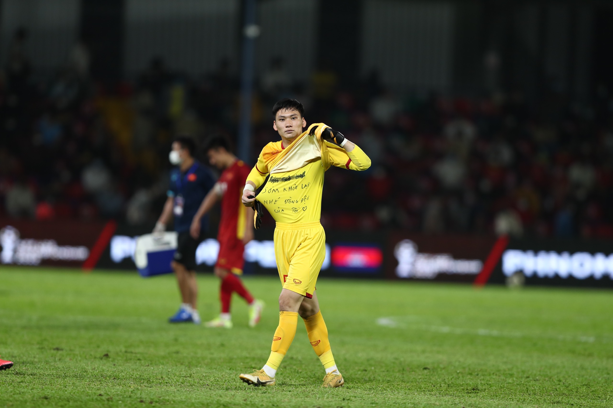 Cụ thể, khi hiệp 1 trận đấu giữa U23 Việt Nam và Thái Lan vừa khép lại, thủ thành trẻ của Đông Á Thanh Hóa đã vén áo đấu để lộ dòng nhắn nhủ được ghi trong áo trong có nội dung: "Sớm khỏe lại nhé đồng đội của tôi".